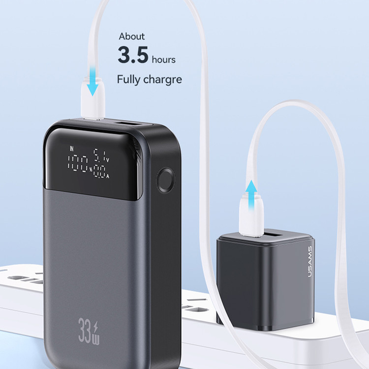 بر روی بدنه پاوربانک با خروجی تایپ سی یوسامز نمایشگر LED قرار داده شده که با فشار دادن دکمه پاور، قابل مشاهده میباشد که قادر است میزان شارژ باتری پاوربانک،میزان ولتاژ و جریان را به شما نشان بدهد. بدنه پاوربانک 33 واتی یوسمز از پلاستیک باکیفیت + ABS بوده که از مقاومت بالایی در برابر ضربه و حرارت دارد.