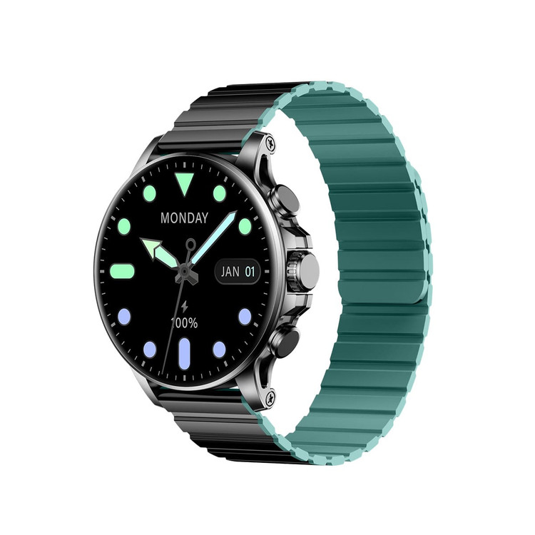 در قسمت اتصال بندها به ساعت نیز شبیه یک پیچ کار شده است که بیشتر به پیچ های تزئینی شبیه است اما توانسته ظاهری جذاب برای این ساعت هوشمند گلوریمی ایجاد کند. درون بسته بندی این مدل ساعت هوشمند دو عدد بند قرار داده شده است. یکی از نوع مگنتی و دیگری از نوع سیلیکونی که هر دو 22 میلی متری و استاندارد هستند.