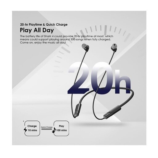 عمر باتری Shark 4 حداکثر میتواند 20 ساعت پخش کند، که به این معنی است که میتواند از پخش حدود 300 آهنگ در صورت شارژ کامل پشتیبانی کند. بیا، تمام روز از موسیقی لذت ببر!
