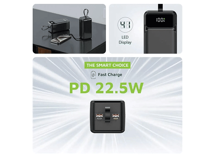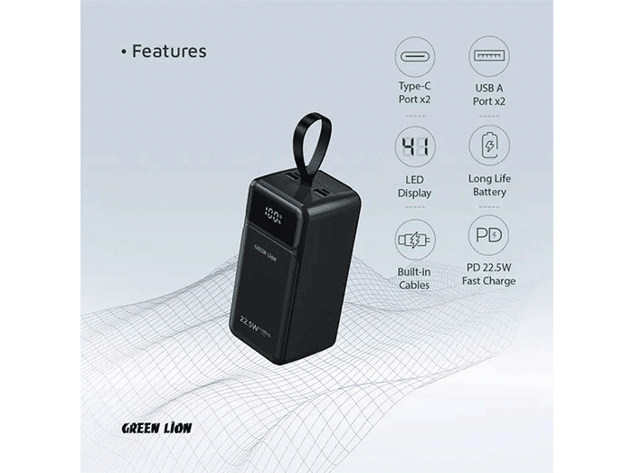 این پاورتانک50000 Green Lion Power Tank مجهز به چند کابل داخلی (USB-A به Micro USB/Lightning/USB-C)، است و حمل آن را راحت می کند.