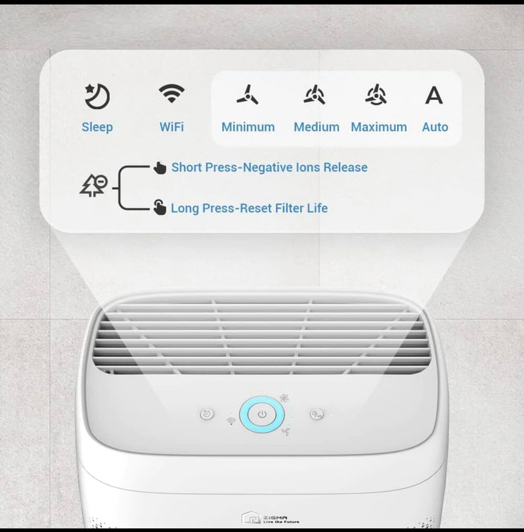 دستگاه تصفیه هوا Zigma مدل Aerio-300 رنگ سفید | مناسب برای اتاقهای بزرگ تا 140 متر مربع، دستگاه تصفیه هوا هوشمند 5 در 1 به همراه فیلتر هپا ترو و کنترل صدا برای حذف دود و بوهای نامطبوع و گرد و غبار.