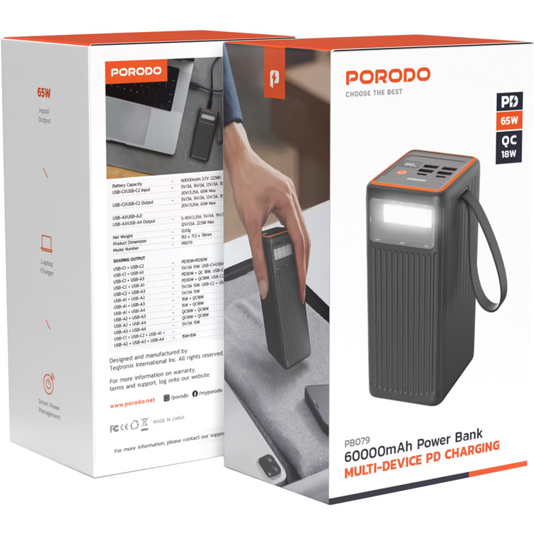 اگر به دنبال یک منبع قدرتمند و مطمئن برای شارژ همزمان چندین دستگاه هستید، پاوربانک Porodo PBFCH079 با ظرفیت ۶۰۰۰۰ میلیآمپر ساعت و خروجی ۶۵ وات، انتخابی بینظیر برای شماست. چه در سفر باشید، چه در محل کار یا در فضای باز، این پاوربانک با قدرت بالا و طراحی هوشمندانه چند پورت، همیشه همراه و پشتیبان شما خواهد بود.