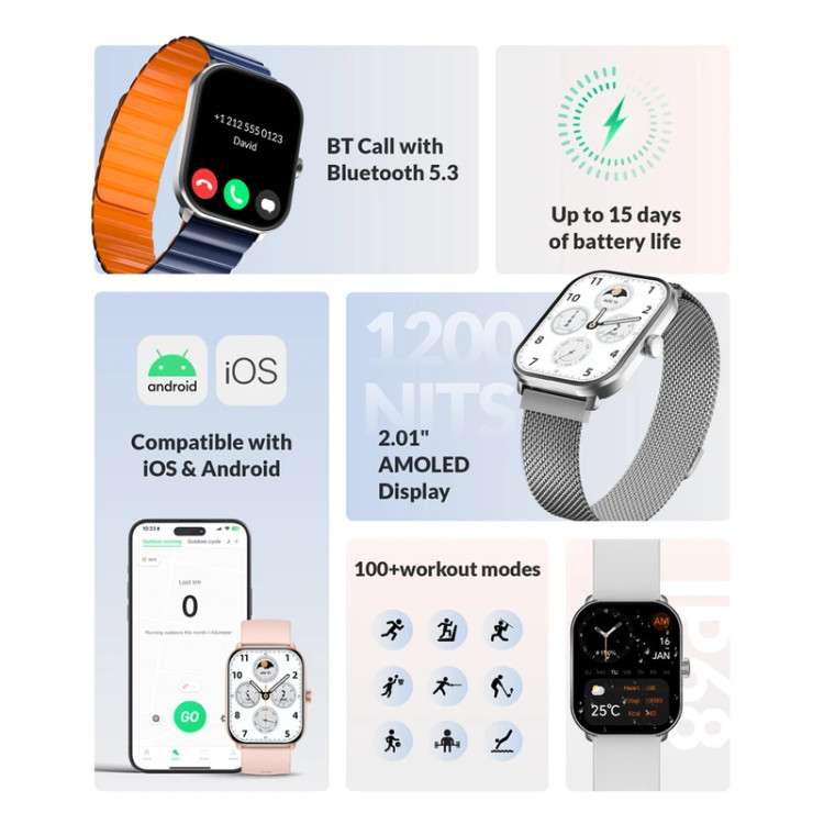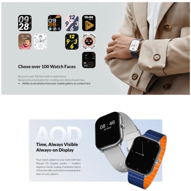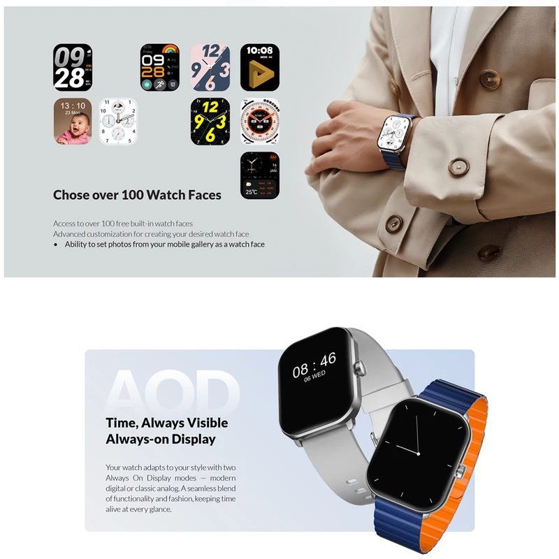 قابلیت مکالمه از طریق بلوتوث / کنترل موسیقی (Music Player) /پشتیبانی از زبان فارسی در منو و سیستمعامل /قابلیت تغییر طرح ساعت یا تم / صفحه همیشه روشن (Always-on Display)