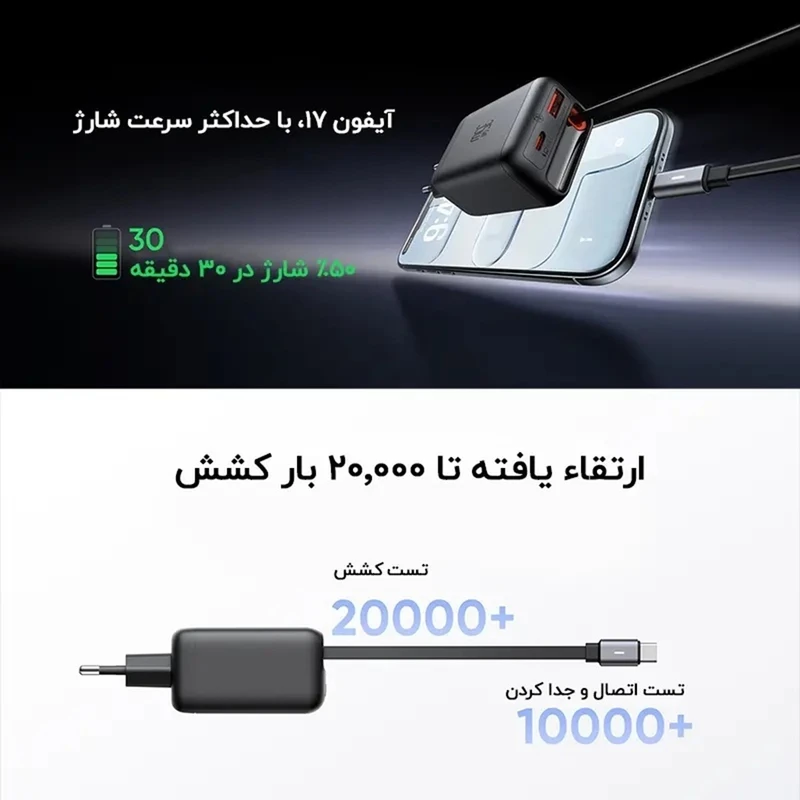 تست دوام کابل تا 10٬000 بار کشش | سیستم محافظت در برابر جریان، ولتاژ و دمای بالا | طراحی سبک و قابل حمل با ظاهر مینیمال | مناسب برای استفاده همزمان در سفر، محل کار و خانه