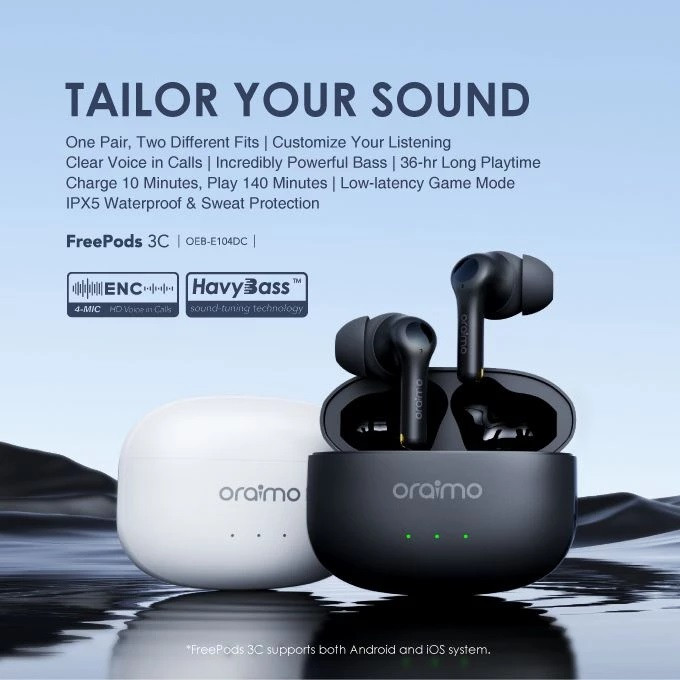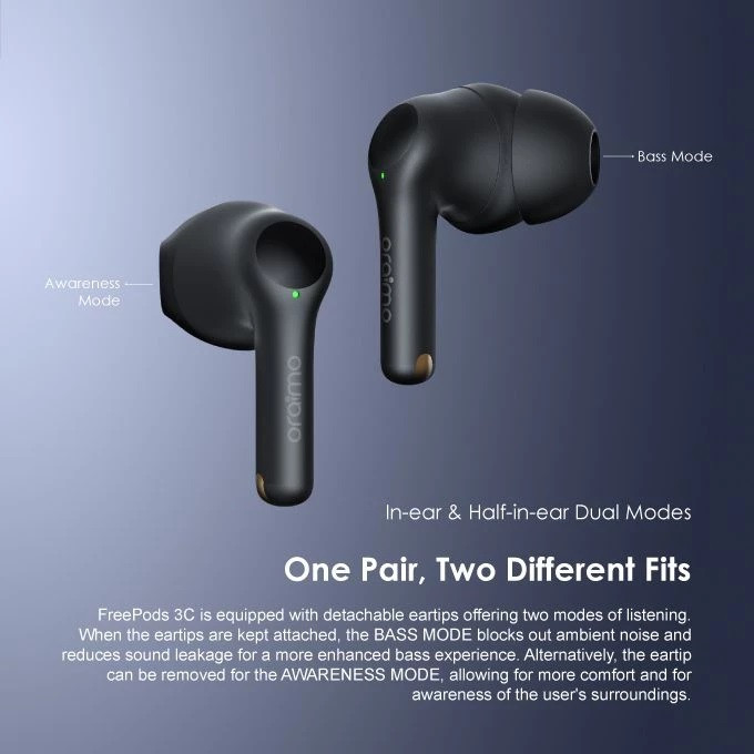 ایرپاد Oraimo FreePods 3C در دو رنگ سفید و مشکی تولید شده است و لمسی هستند. پس تنها با لمس هریک از شاخه های هندزفری بی سیم می توانید، دستورات لازمه را به آن ها وارد کنید. سری های سیلیکونی دارند تا بر اساس ابعاد داخلی گوش خود، مناسب ترین نوع سری را انتخاب کنید و استفاده خوبی از آن را تجربه نمایید. متریالی که در ساختار این محصول به کار بردند نیز از نوع PC و همینطور ABS می باشد. در دو حالت کامل داخل گوش و نیمه در گوش می توانید از آن ها استفاده کنید.