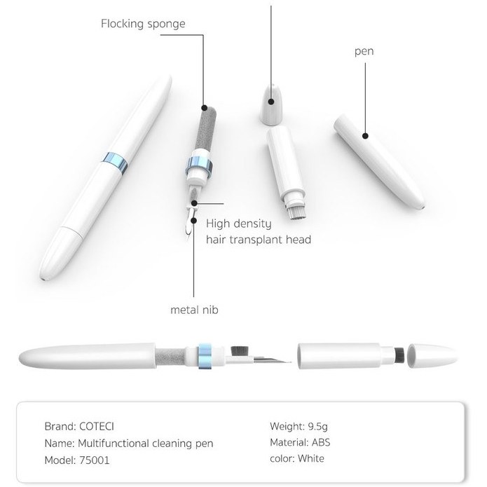 قلم تمیزکننده Coteetci 75001 بدنهای از جنس پلاستیک ABS و نوکی از فلز دارد تا در برابر ضربه و آسیب مقاوم باشد. این قلم ابعادی برابر با 135×13 میلیمتر داشته و وزن آن 9.5 گرم است. که میتوانید آن را داخل کیف خود قرار داده و همیشه همراه خود داشته باشید .