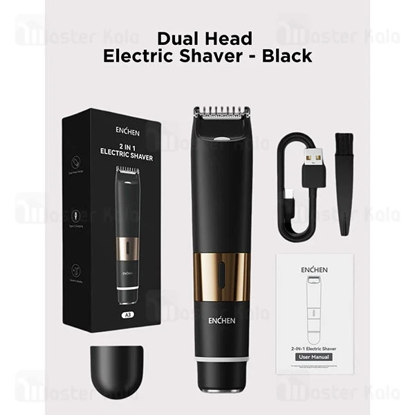 داخل جعبه ماشین اصلاح A3، ماشین اصلاح Enchen A3 در رنگ آبی، کابل USB-C برای شارژ، برس تمیزکننده، محافظ هد دایرهای و دفترچه راهنمای استفاده موجود است. این بسته کامل نیازهای اولیه شما برای استفاده روزمره و سفر را پوشش میدهد و به راحتی قابل حمل است.
